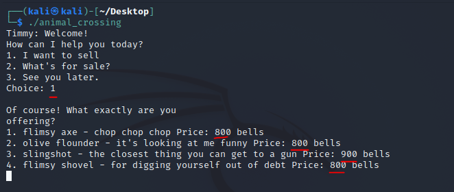 flimsy axe를 팔아봤더니 800벨을 주고,