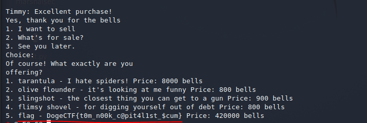 돈이 다 모이면 flag를 구입하고, 인벤토리를 확인하기 위해 물건 팔기 메뉴로 들어간다.