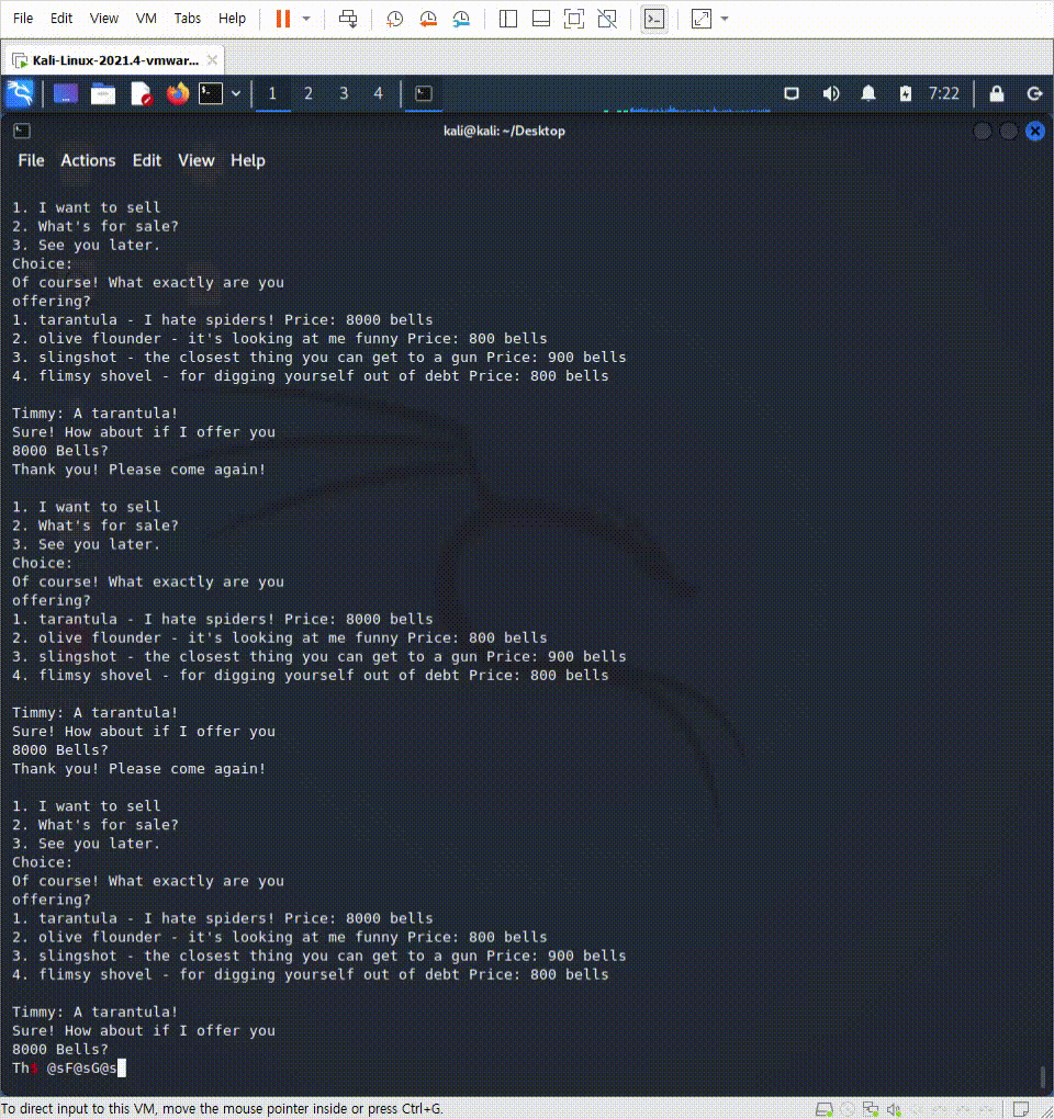 p.sendline(b'1') #타란튤라 팔기 x 53번