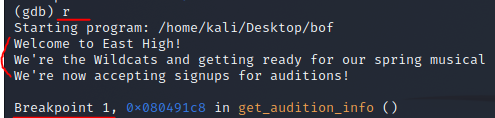 audition() 함수의 주소는 info func 명령어로 확인이 가능하다.