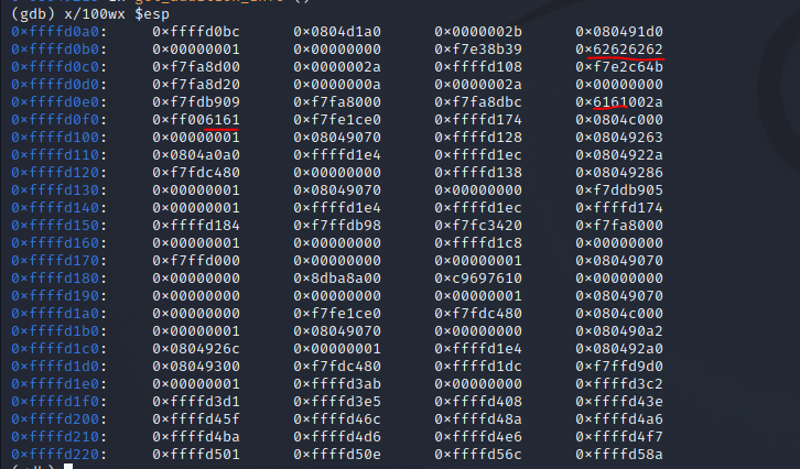 x/100wx $esp 라고 입력하면 스택의 상태를 확인해볼 수 있다.