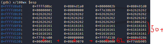 a를 51개 넣었더니 위처럼 0xf7fdc400가 0xf7fd0061 이 된 것을 볼 수 있다.