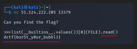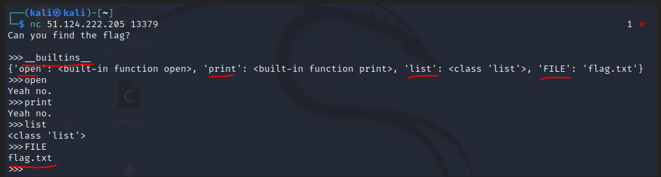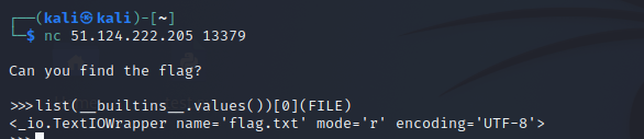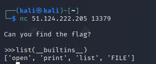 이번 문제에도 서버에 접속해서 __builtins__ 라고 입력해보니 위처럼 출력값이 나왔다.