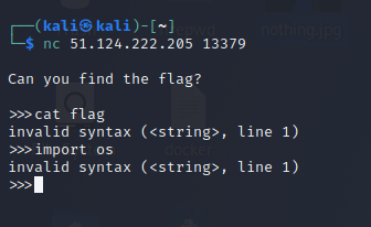 시험삼아서 cat flag / import os 이런 명령어들을 쳐봤는데