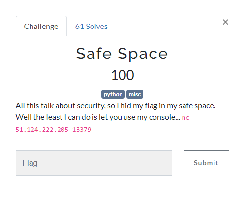 문제 설명을 읽어보면 safe space에 플래그를 숨겨두었다고 한다.