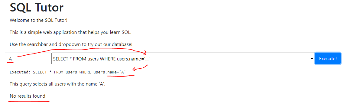 A를 입력하면 SELECT * FROM users WHERE users.name='A' 이렇게 쿼리가 만들어지지만