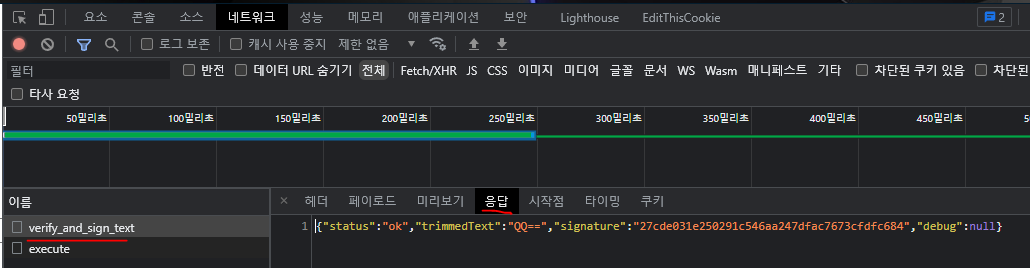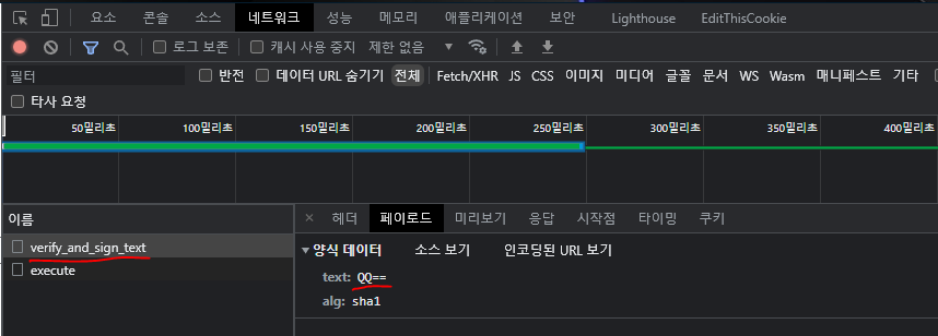 내가 입력한 A가 base64로 인코딩되어서(QQ==) /verify_and_sign_text 경로로 전달되고 있는것이 보인다.