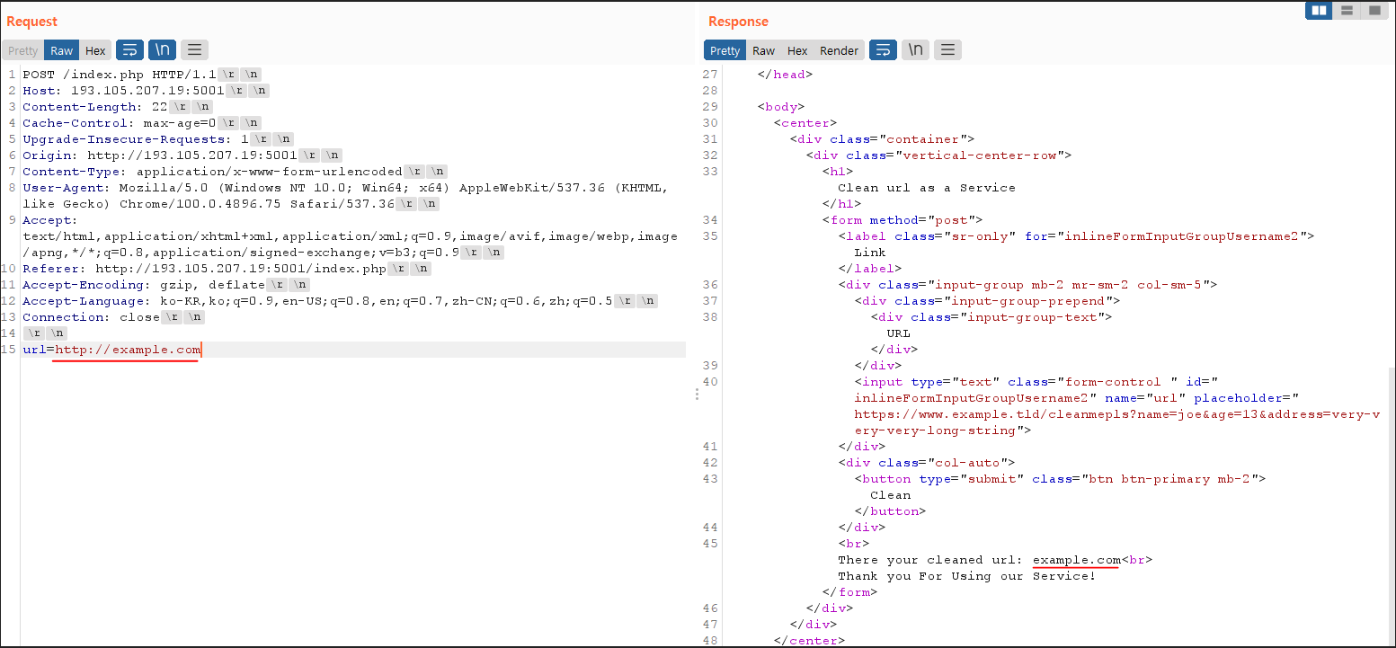 그랬더니 왼쪽 응답 패킷에서 원래 출력되던 There your cleaned url 과 더불어