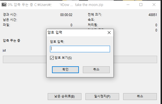 zip 파일은 압축을 풀려고 시도하면 이렇게 비밀번호가 걸려있는걸 볼 수 있다.