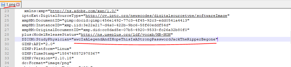 그랬더니 이미지 파일의 메타데이터가 있는 부분에 이렇게 비밀번호가 적혀있는걸 볼 수 있었다.