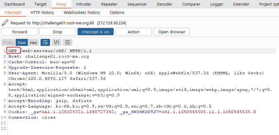 Burp Suite 도구를 이용해서 문제 페이지에 접속할때 패킷을 잡아본다.