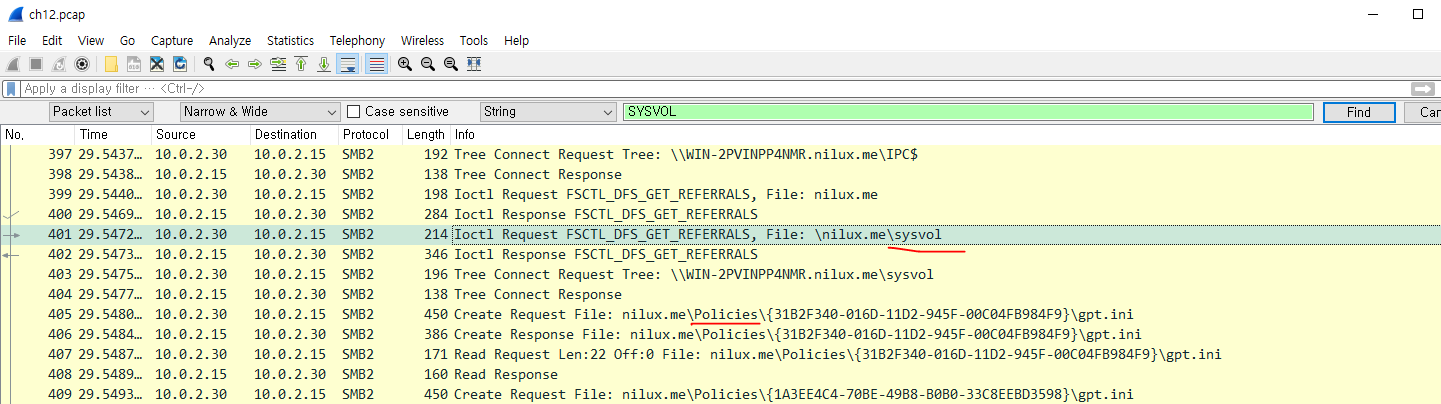 401번째 패킷에서 SYSVOL 이라는 경로가 있는걸 확인했다.