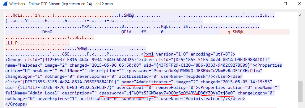 xml 내용에는 Administrateur의 비밀번호(cpassword)로 추정되는 인코딩된 문자도 같이 보였다.