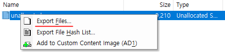 우선 unallocated space 부분을 우클릭 - Export_Files으로 뽑아내 준다.