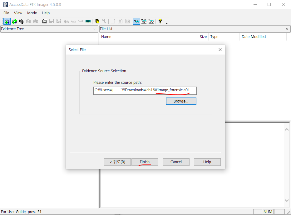 그다음 주어진 image_forensic.e01 파일을 선택해주고
