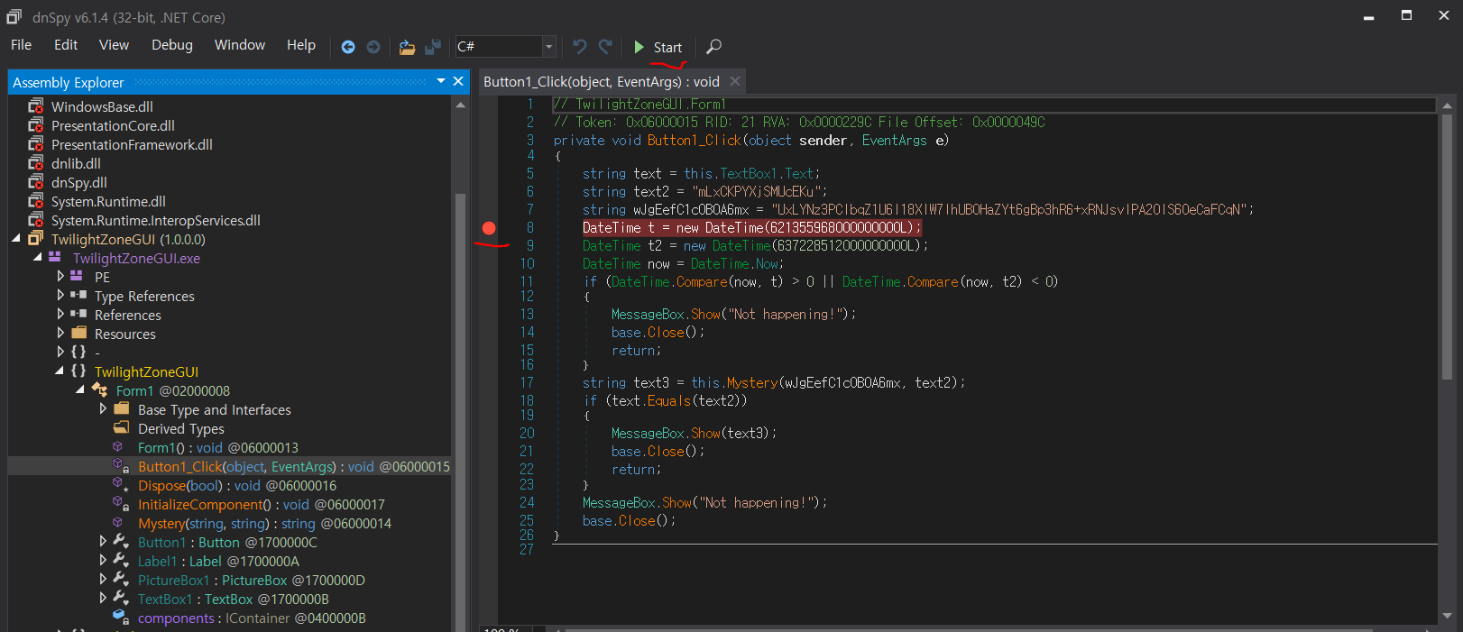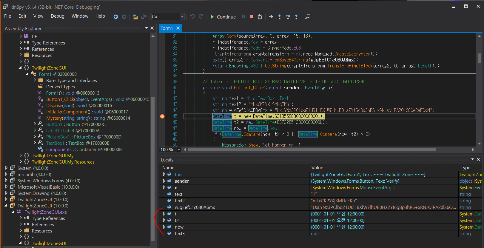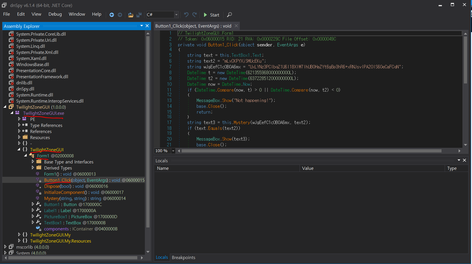 TwilightZoneGUI - TwilightZoneGUI.exe - TwilightZoneGUI - Form1 - Button1_Cilck 으로 타고 들어가면 된다.