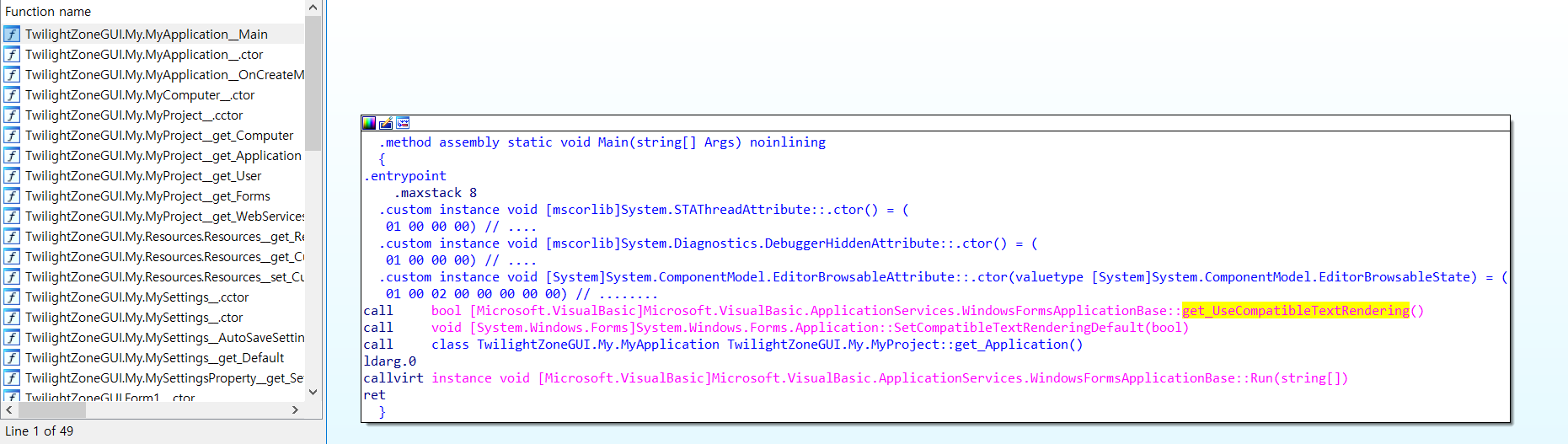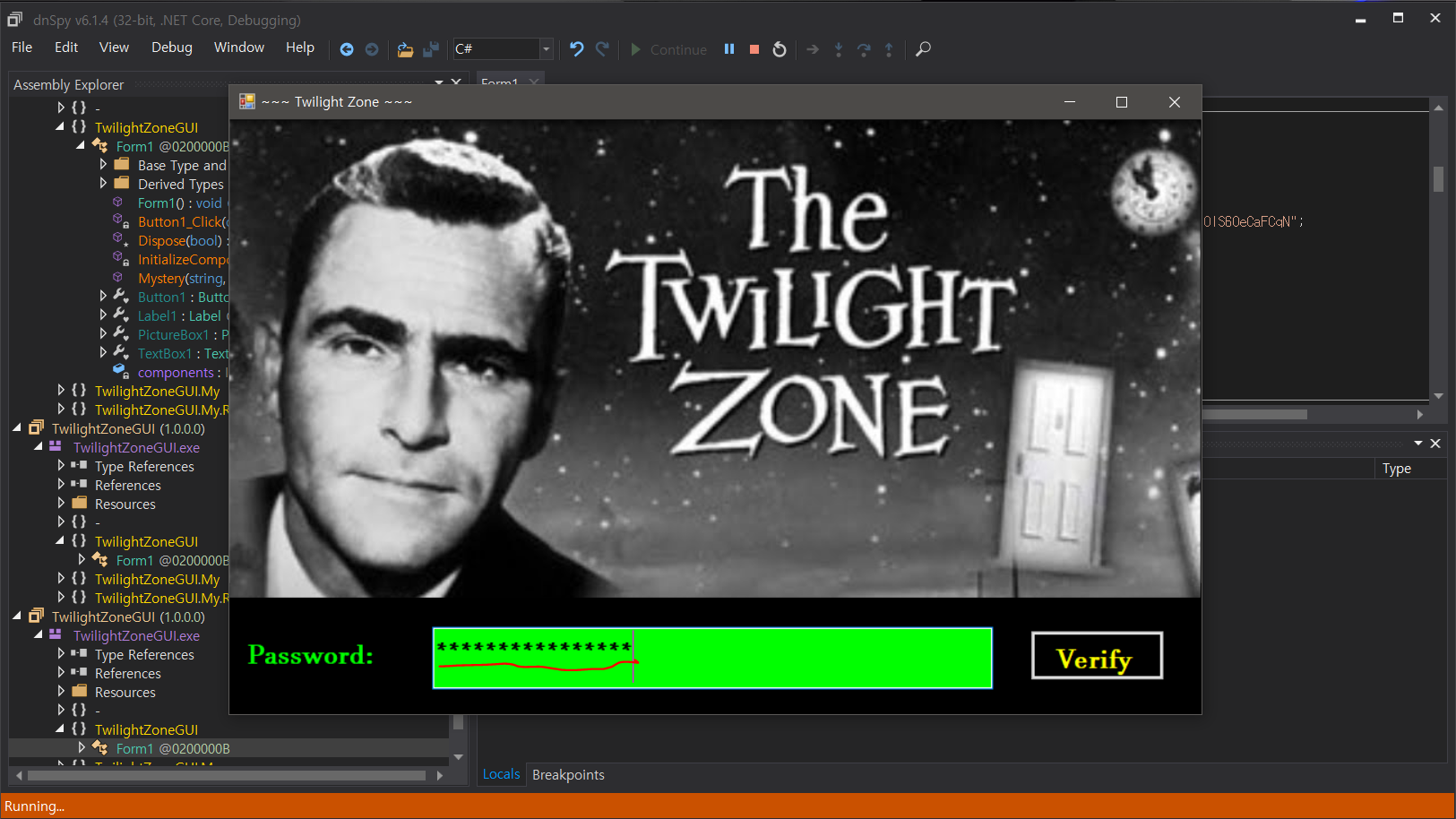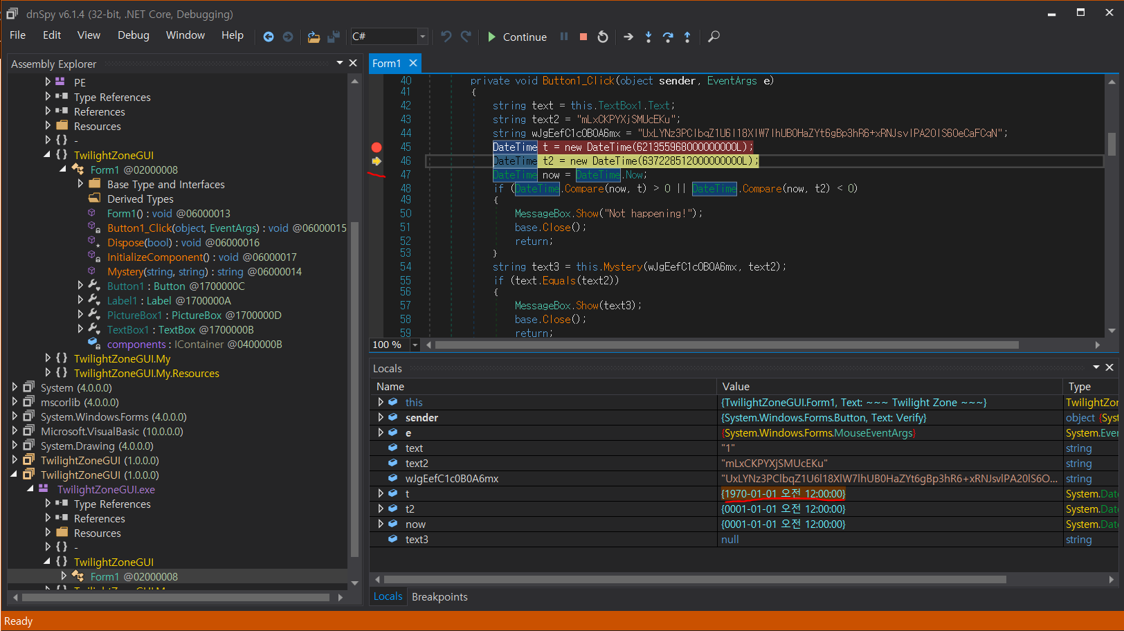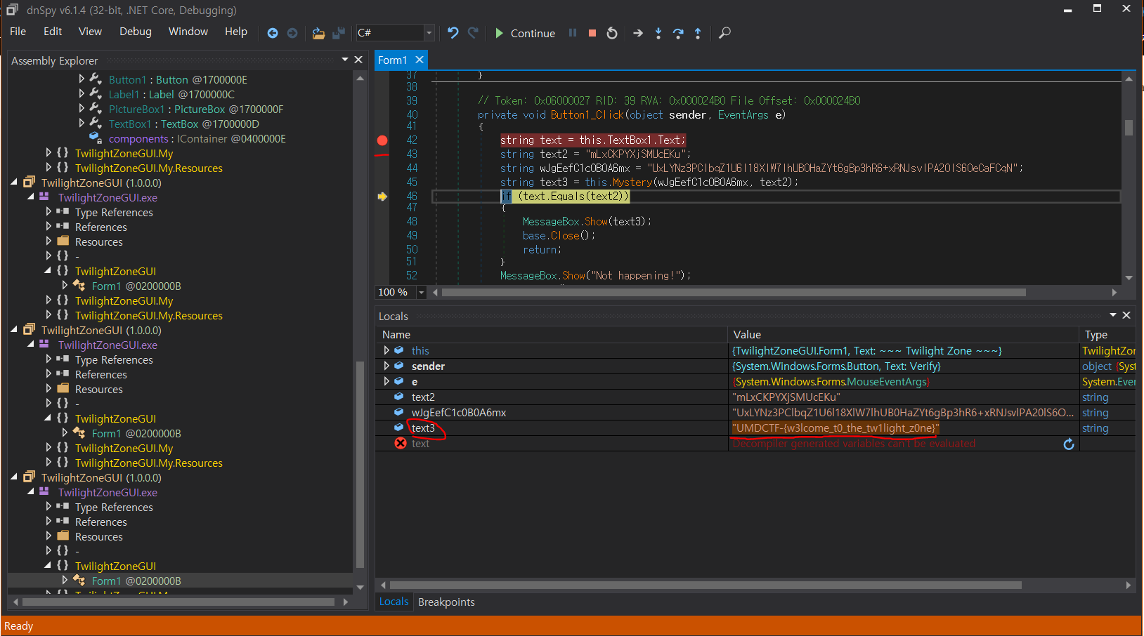 TwilightZoneGUI - TwilightZoneGUI.exe - TwilightZoneGUI - Form1 - Button1_Cilck 으로 타고 들어가면 된다.