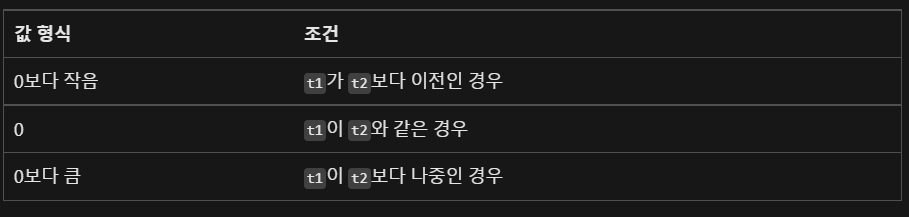 Compare 함수의 경우 t1이 t2보다 나중일 경우 양수를 반환한다.