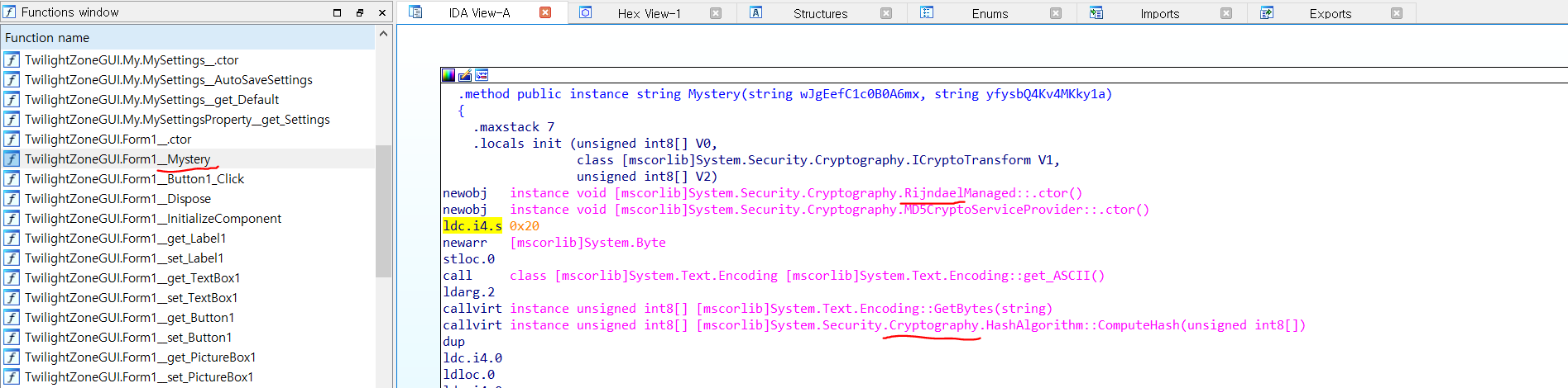 Mystery라는 함수가 있어서 내용을 살펴보는데 뭔가 암호화시켜서 저장하고 있는듯 보였다.