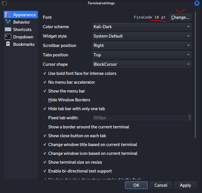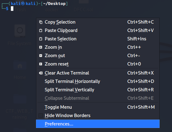 칼리 리눅스 터미널에서 우클릭 - Preferences... 버튼을 눌러준다.