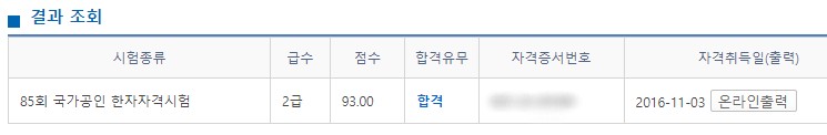 2016년 11월 취득한 한자교육진흥원 한자 2급