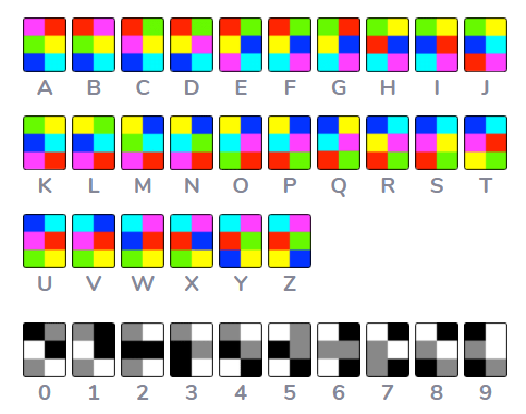 이렇게 빨강, 노랑, 초록, 파랑, 하늘, 분홍색의 조합으로 각 알파벳을 표현하고,