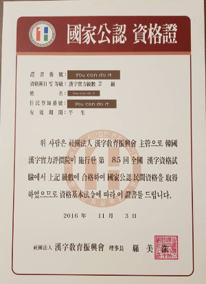 2016년 11월 취득한 한자교육진흥원 한자 2급