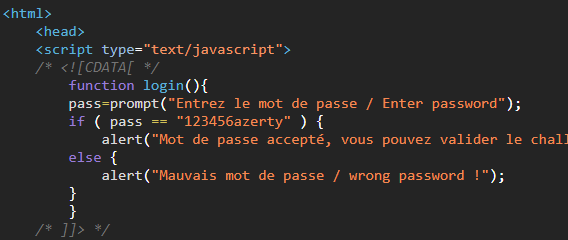 개발자도구로 웹 소스를 보면 pass = "123456azerty" 라고 비밀번호가 적혀있는것을 확인할 수 있다.