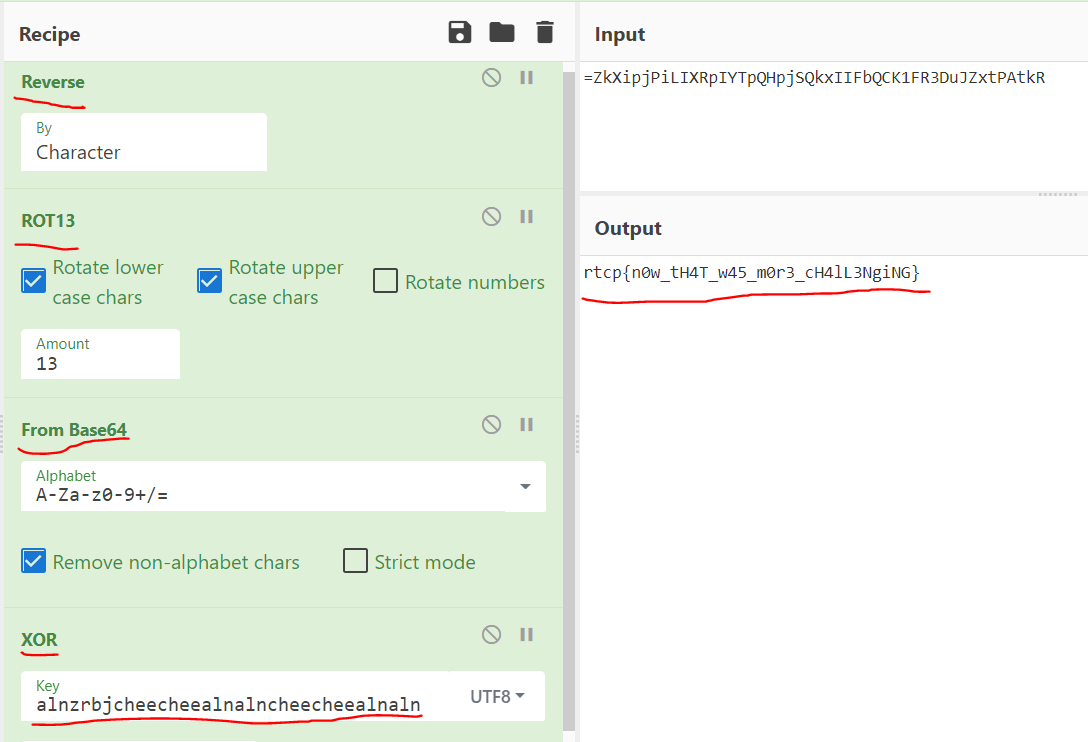 reverse(rot13(base64encode(userinput ^ rot13(key)))) = result 이다.