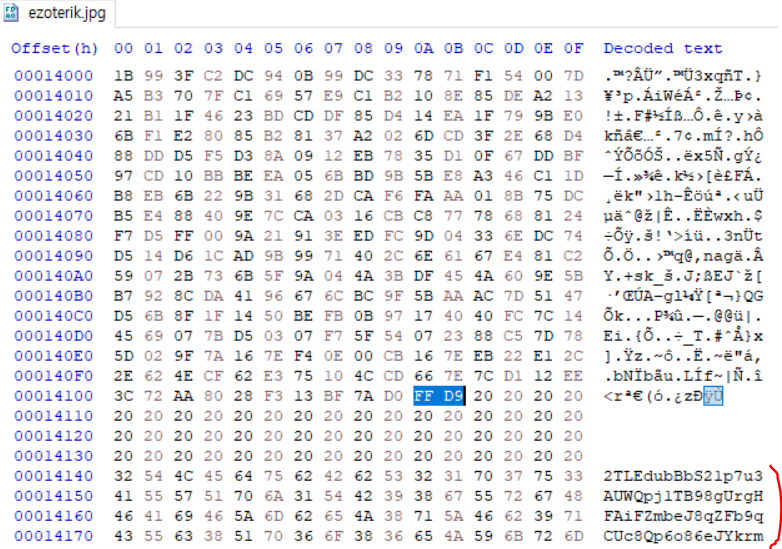 FF D9에서 파일이 끝나지 않고, 아랫쪽에 이상한 문자열이 더 있는것을 볼 수 있다.