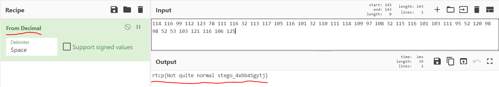 CyberChef에서 From Decimal 을 이용해 ASCII 코드 디코딩을 해주면