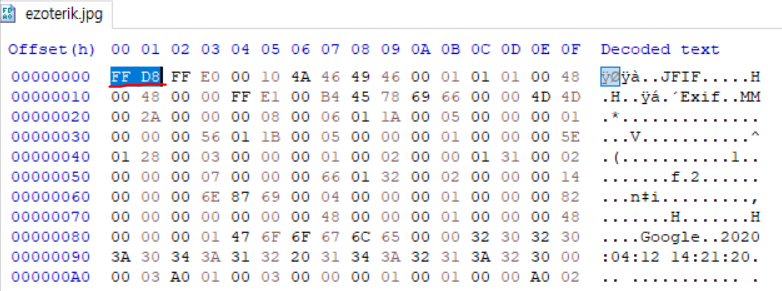 파일 맨 앞에 FF D8 이라는 문자열이 나오는것을 볼 수 있다.