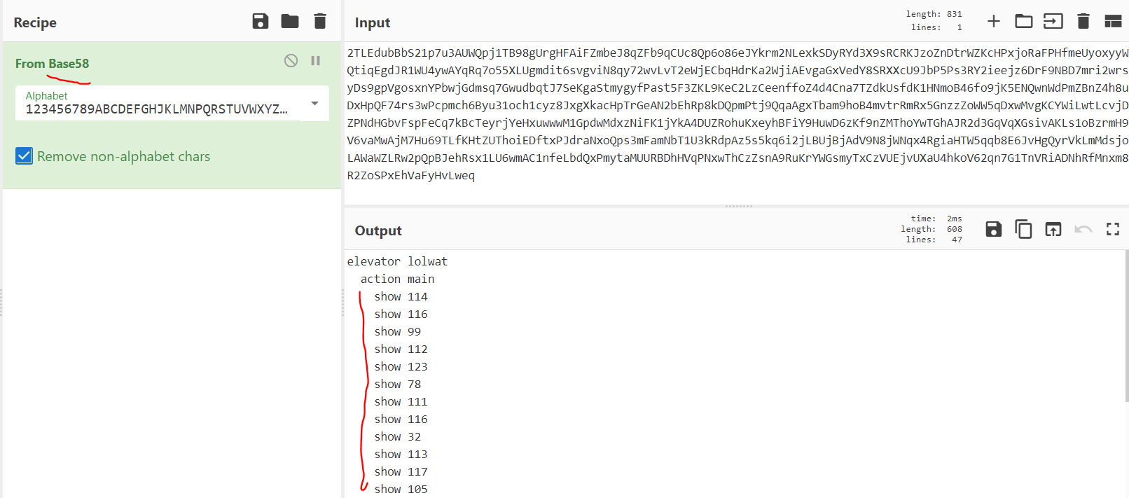 여러가지 시도해보다가 Base58로 디코딩을 해봤더니