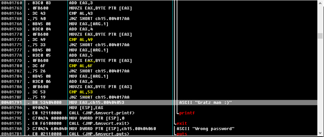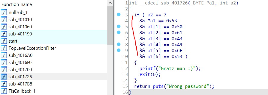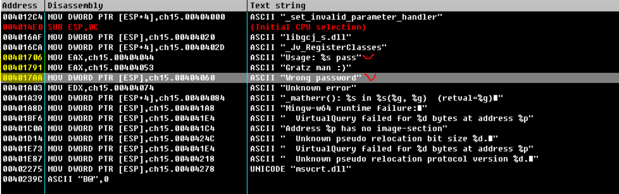 아까 봤던 Usage와 Wrong password가 보이고, 중간에 Gratz man :) 이라는 문자열도 보이는데