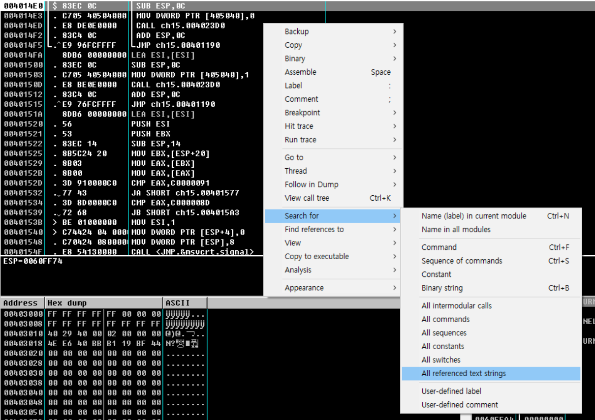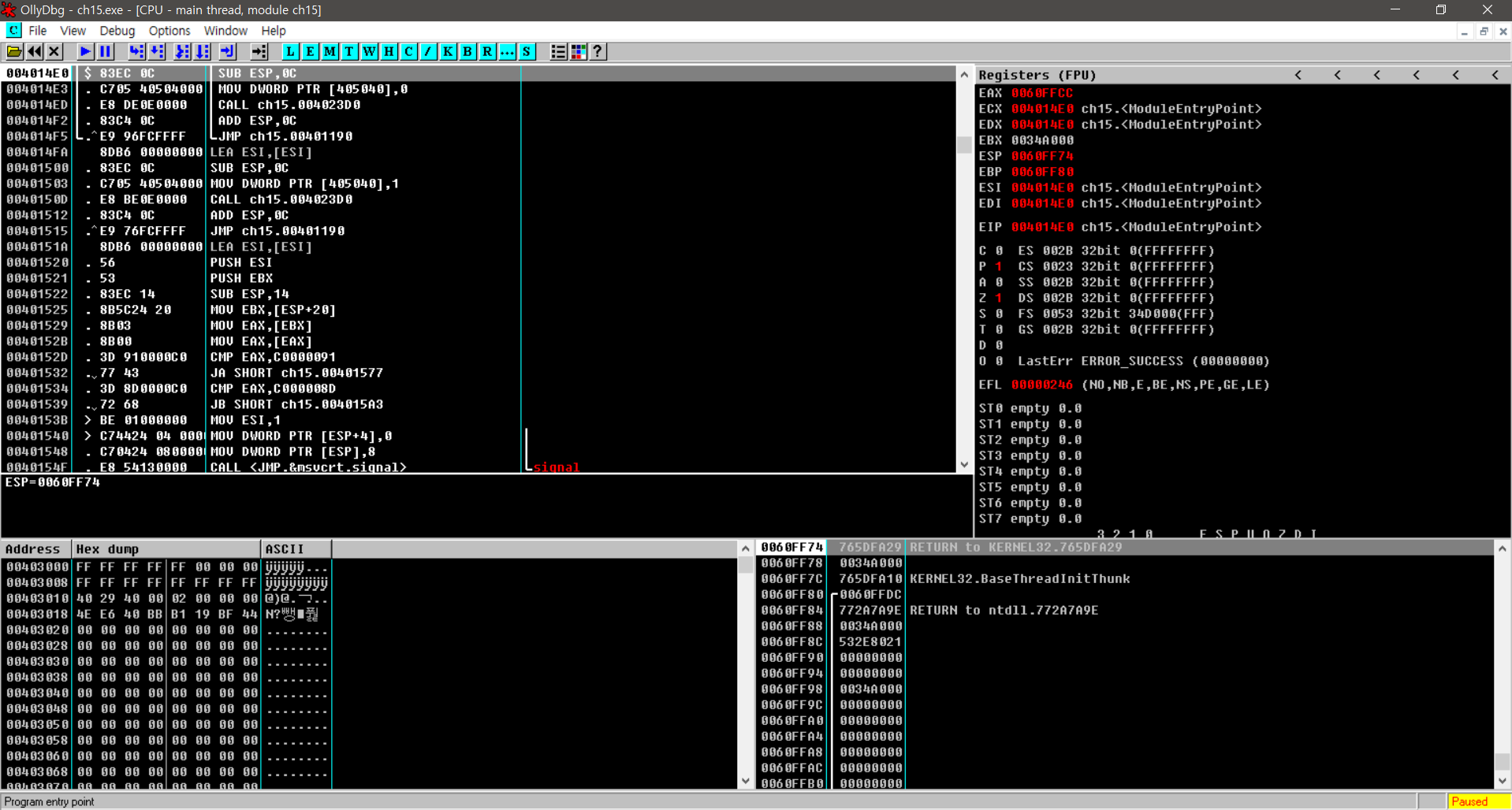 Ollydbg에 문제파일은 ch15.exe 파일을 드래그 앤 드롭 했을때 모습이다.