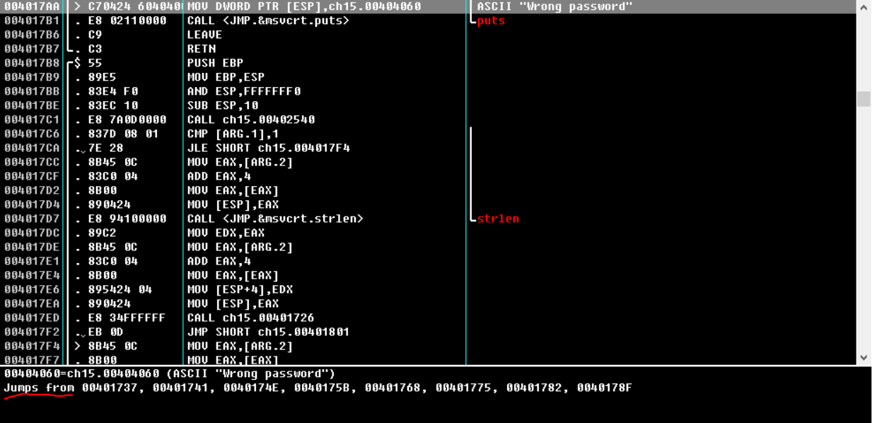 이것은 뒤에 나열되어있는 주소부분에서 Wrong password로 프로그램 흐름이 흘러간다(점프)는 것이다.