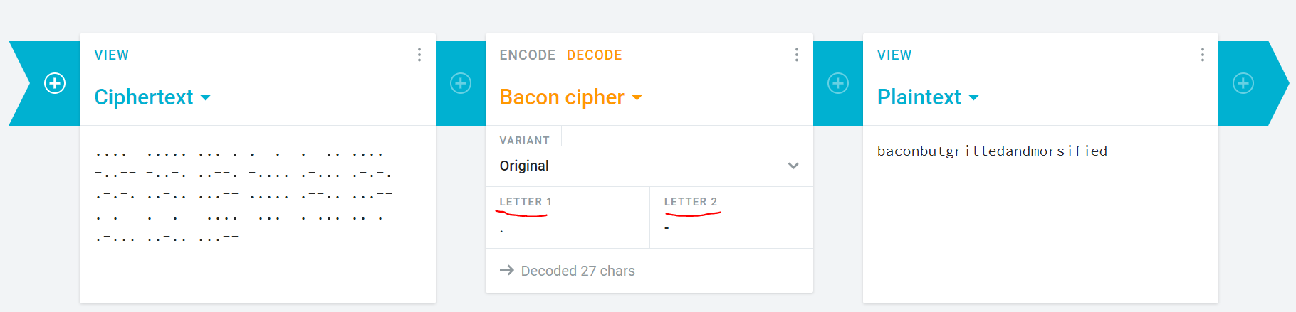 bacon cipher를 디코딩해주는 사이트로 가서(https://cryptii.com/pipes/bacon-cipher)