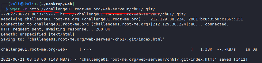 wget 명령에 -r 옵션(recursive) 을 줘서 .git/ 디렉터리 아래에 있는 모든 파일들을 칼리 리눅스로 가져올 수 있다.