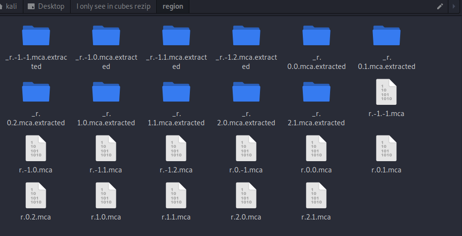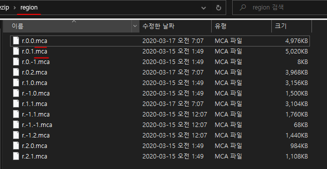 region 폴더에 들어가보니 이렇게 .mca 확장자를 가지는 파일들이 많이 보였다.