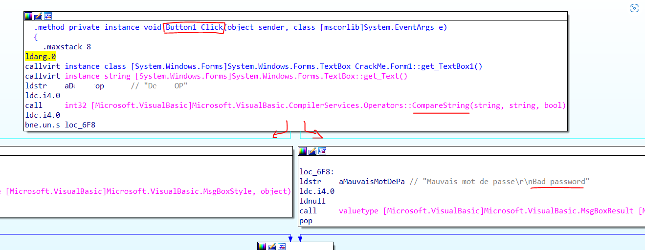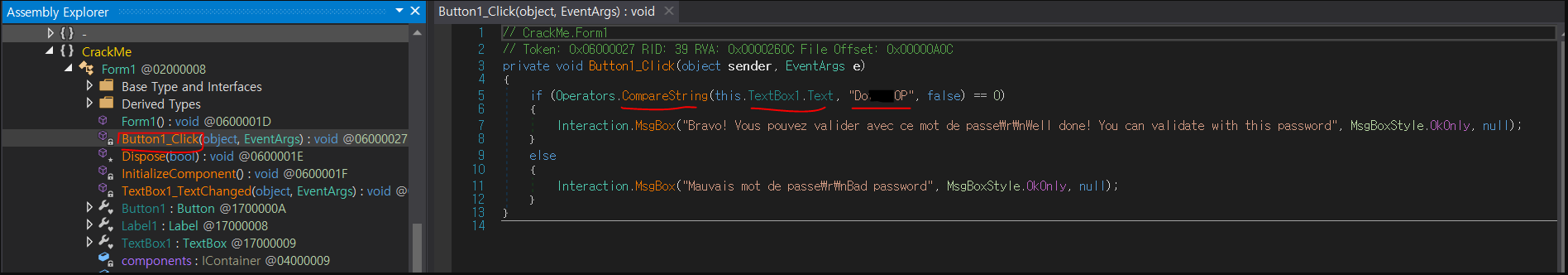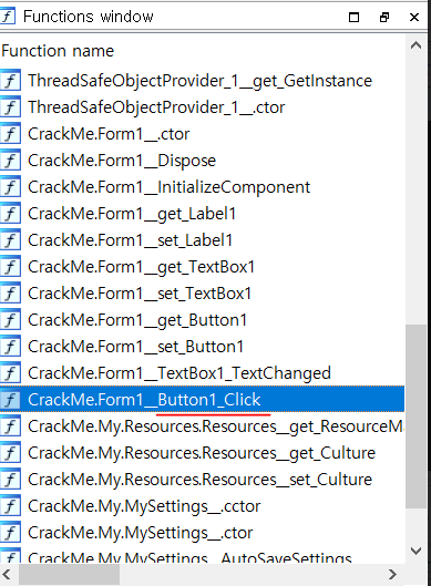 오른쪽 Functions window에서 Button1_Click 이라는 함수를 찾았다.
