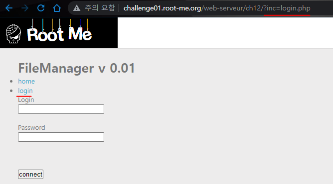 이번에도 URL에서 inc 변수로 login.php 페이지를 불러오고 있었다.