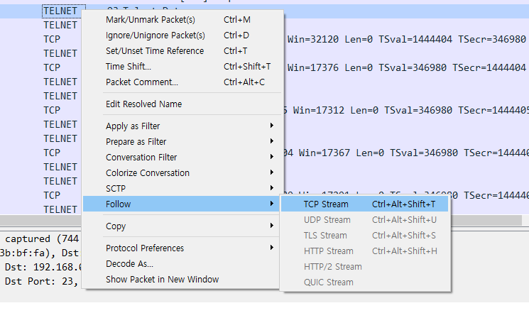 TELNET 패킷 중 아무거나 하나를 골라서