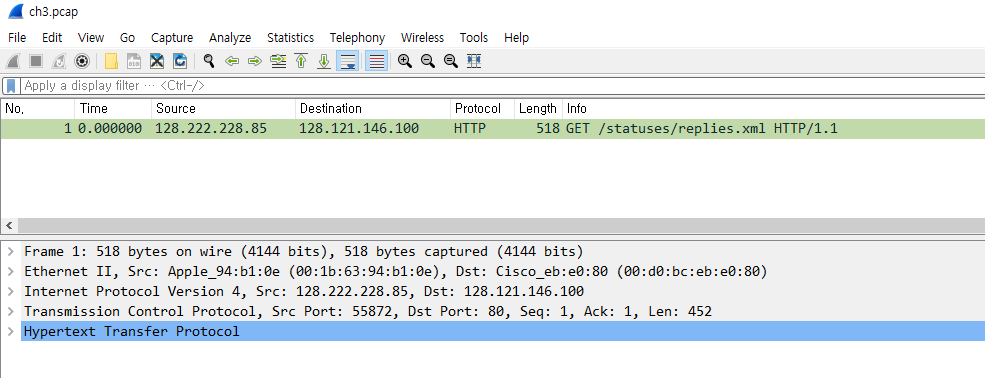 Wireshark 도구를 이용해 ch3.pcap를 열어보면