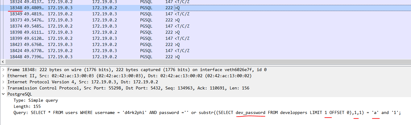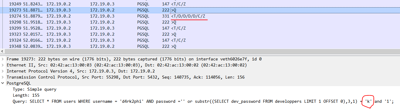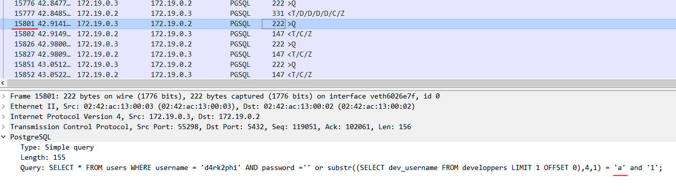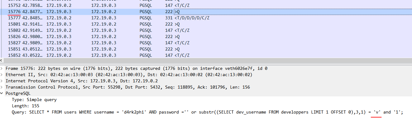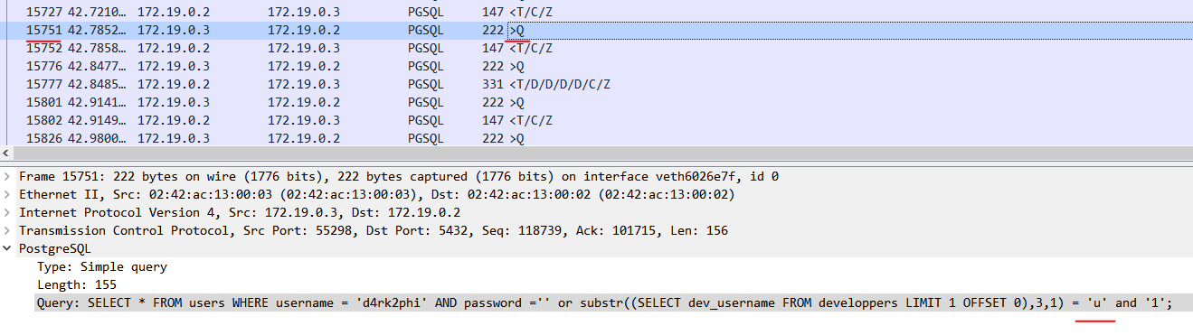 이 패킷에서는 developers 테이블의 dev_username 컬럼어 저장된 첫번째 계정의 세번째 글자가 u 인지 물어보고 있다.