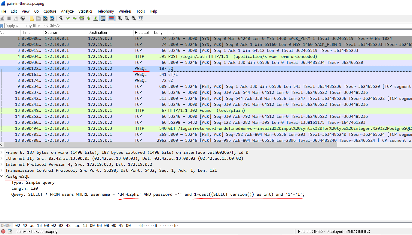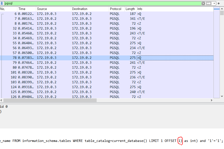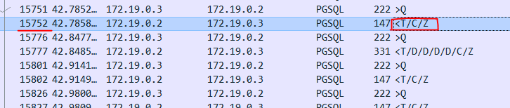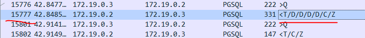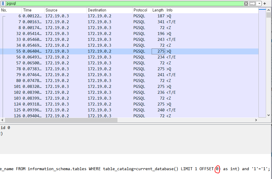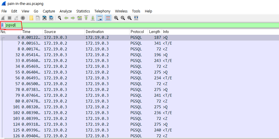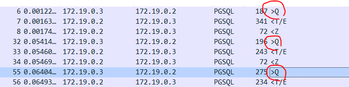 수많은 패킷들 중에서 맨 끝에 >Q 라고 표시되어있는 패킷이 실제 데이터베이스에