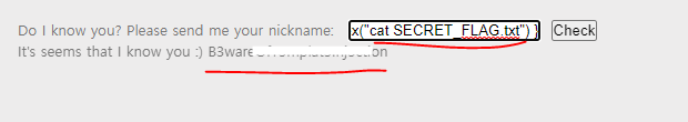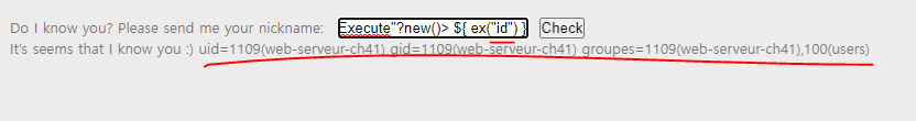 문서를 읽어보면 위처럼 입력할 경우 SSTI 취약점을 이용해 ex( ) 안에 있는 명령어가 실행된다고 한다.