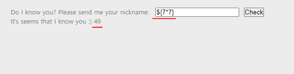 당연히 아래쪽에는 It's seems that I know you :) ${7*7} 이라고 나와야하지만