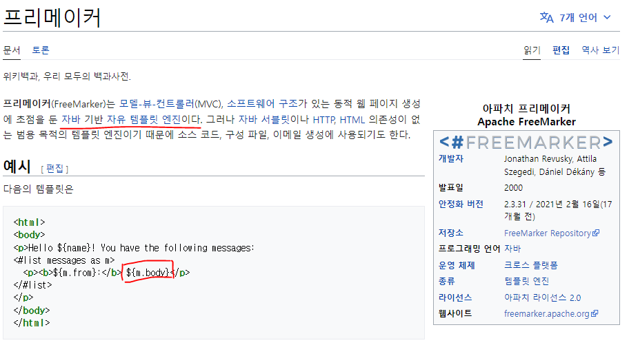 구글에 FREEMARKER를 검색해보면, 위키 백과에 아주 잘 설명이 되어있다.