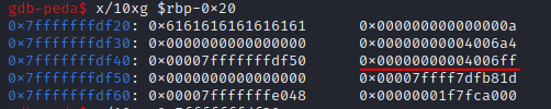 61616161 에서 멀지 않은곳에 0x00000000004006ff 가 써있는게 보인다.