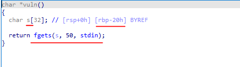 여기서 살펴볼 것은 s변수는 총 32바이트 할당되어 있으며, 시작은 rbp-0x20 이라는 것이다.